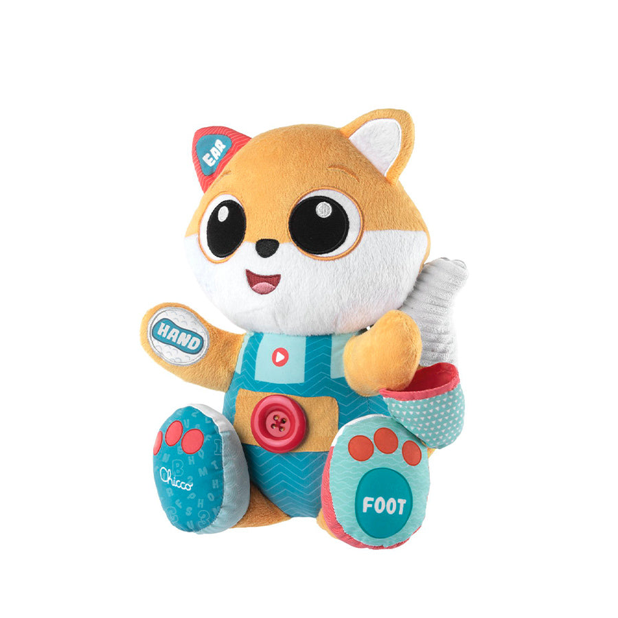 Chicco Raposa Falante Bilingue é um brinquedo em peluche macio, evolutivo e interativo que ajuda as crianças a aprender as partes do corpo e como se vestir de forma divertida em português e inglês