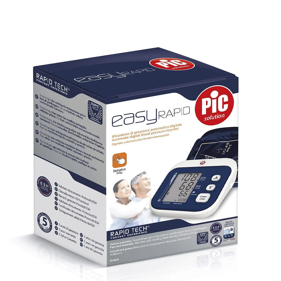 PIC Easy Rapid Tensiómetro Braço é um medidor intuitivo da pressão arterial automático e digital de braço. Forma inovadora, graças ao design DLS, adota a tecnologia de última geração Rapid Tech - Comfort Experience para uma medição antecipada já durante o enchimento. Oferece um resultado rápido e confortável.