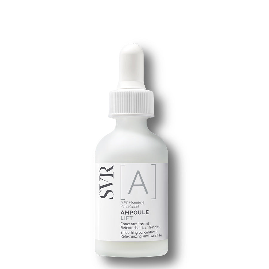 SVR Ampoule A Lift Sérum com 0,3% de retinol puro combinado com 2% de NovoRetin™ promove a renovação celular, uniformiza e suaviza visivelmente a pele. Há uma redução das marcas vermelhas e manchas escuras e as rugas são suavizadas, proporcionando um efeito de “pele nova”. Enriquecido com niacinamida e ceramidas para proteger e fortalecer a barreira cutânea, este sérum foi testado em todos os tipos de pele.