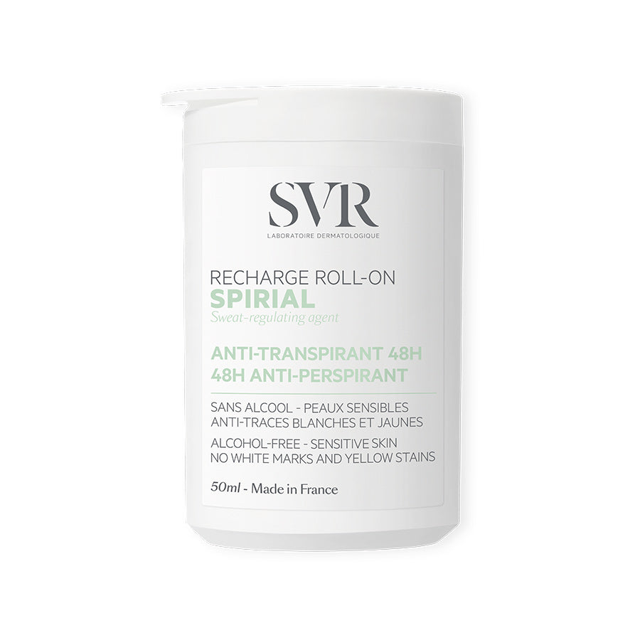 SVR Spirial Deo Roll-On Eco-Refil 50ml é uma eco-recarga de substituição para o desodorizante Spirial, numa fórmula de elevada tolerância, especialmente desenvolvida para o uso diário em situações de transpiração normal a excessiva, incluindo na pele mais sensível. Sem perfume, sem álcool, sem parabenos, sem deixar manchas brancas e com uma eficácia comprovada de 48H.