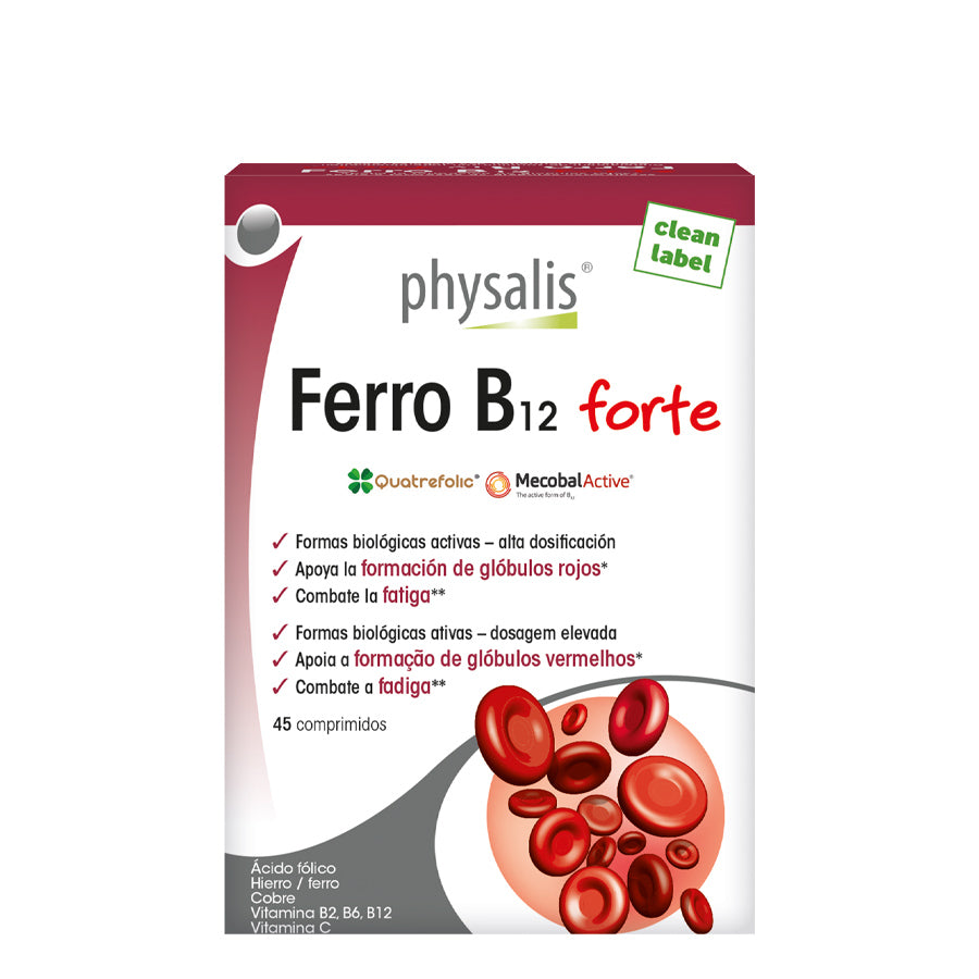 Physalis Ferro B12 Forte é um complexo completo de ferro e vitaminas B ativas que apoia a formação de glóbulos vermelhos, o metabolismo e absorção do ferro, ajudando a combater a anemia e a fadiga associadas à sua carência.