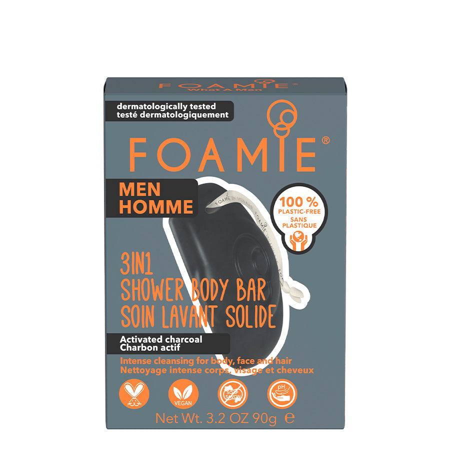 Foamie Men's 3-in-1 Solid Bath Gel with Activated Charcoal is a men's bath gel in the form of a cleansing bar with 3-in-1 action: hair, face and body. Practical and effective cleansing from head to toe. With Activated Charcoal, Vegetable Oils and Cocoa Butter for a moisturizing action and intense cleansing.