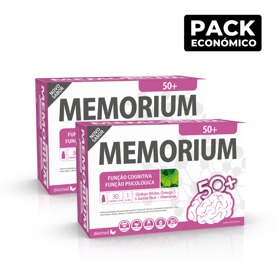 Memorium 50+ is a food supplement based on nutrients that are useful for maintaining memory, particularly in the case of normal loss that occurs with aging. It enhances physical and mental performance, improving memory, cognitive capacity, vitality and natural defenses. Contains a vitamin complex, Gnikgo Biloba, Zinc, Omega 3 and Royal Jelly. Orange flavor.