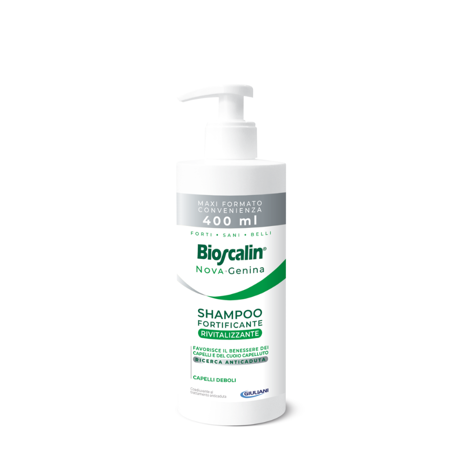 Bioscalin Nova Genina Revitalizing Fortifying Shampoo formulated based on Giuliani anti-hair loss research for weakened, lifeless hair with a tendency to fall out. It is ideal as a complement to local or oral hair loss treatments, leaving hair with more volume and strength.