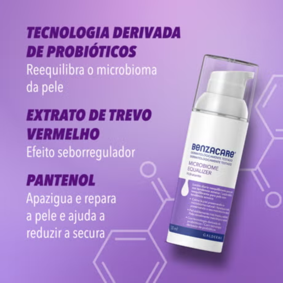 Benzacare Microbiome Equalizer Moisturizing Lotion contains probiotic-derived technology to rebalance the microbiome of acne-prone skin. It provides 24-hour hydration, sebum-regulating properties, and helps reduce the appearance of blemishes.