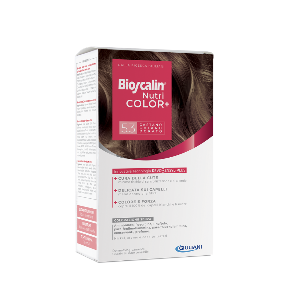 Bioscalin Nutri Color+ Hair Dye 5.3 Light Golden Brown is a dye used for hair coloring. Ideal for an intense and longer-lasting color with 100% coverage of gray hair. Thanks to the innovative RevoSensyl-Plus Technology and the elimination of the most common sensitizing agents, it allows greater safety and greater tolerability.