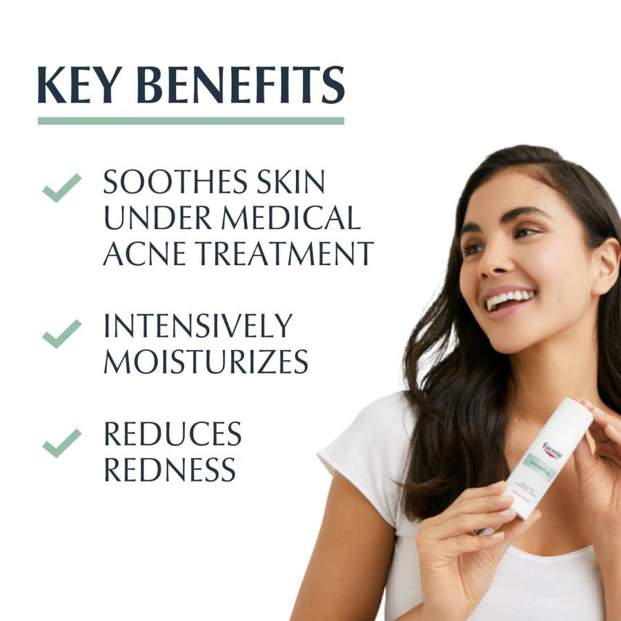 Eucerin Dermopure Oil Control Moisturising Adjuvant Care intensely moisturises and compensates for the drying effects of anti-acne medication (e.g. isotretinoin). Strengthens the skin's protective barrier and reduces moisture loss. Soothes irritation and redness. Reduces tightness and burning sensations.