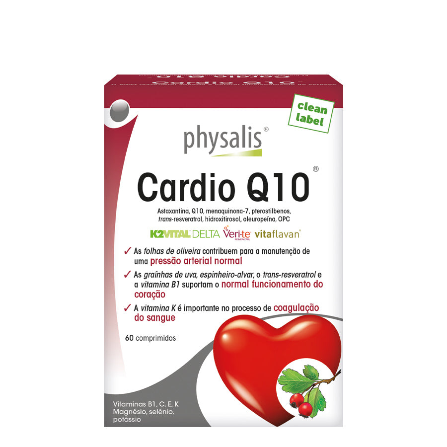 Physalis Cardio Q10® is a unique complex consisting of a synergistic combination of plant and (phyto)nutrients, hawthorn grape seed, trans-resveratrol and vitamin B1, substances that support the normal function of the heart. Potassium and olive leaf extract (20% oleuropein) contribute to maintaining normal blood pressure. Vitamin K, in the form of double-protected and encapsulated MK-7 (K2VITAL® Delta), is important for the blood clotting process. Magnesium supports normal muscle function and thus also heart muscle contractions. Vitamin E and selenium help protect cells against undesirable oxidation, as does vitamin C, which also supports normal collagen formation for the normal function of blood vessels. Physalis Cardio Q10® also contains Mediteanox®, a pure olive concentrate with hydroxytyrosol, naturally fermented coenzyme Q10, pterostilbenes extracted from the trunks of Malabar kino (Pterocarpus marsupium) and AstaPure®, the natural astaxanthin (carotenoid) from the microalgae Haematococcus pluvialis.