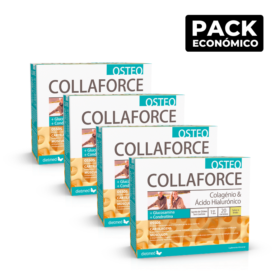 Collaforce Osteo es un suplemento dietético para huesos, cartílagos y músculos. Su fórmula contiene Calcio, necesario para el mantenimiento de los huesos en condiciones normales, Vitamina C, que contribuye a la formación normal de colágeno, y Vitamina D y Magnesio, que contribuyen al mantenimiento de los huesos en condiciones normales y al funcionamiento normal de los músculos.
