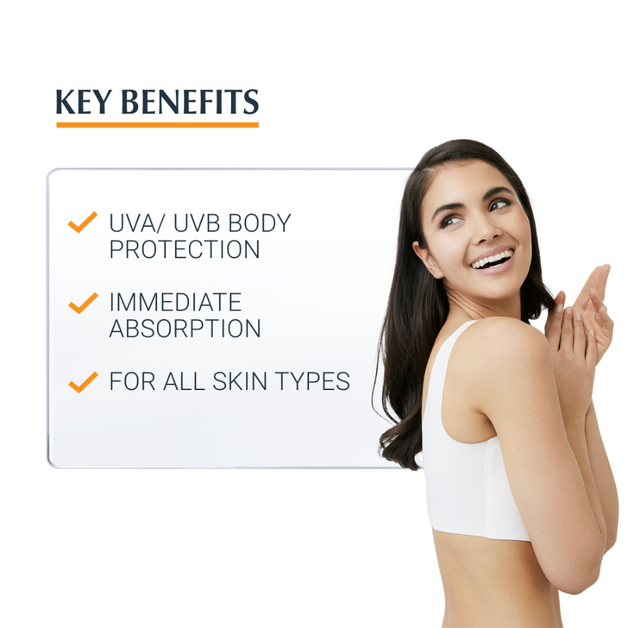Aplicar sobre el cuerpo antes de la exposición al sol. Reaplicar con frecuencia, especialmente después del baño, de transpirar o en caso de roces.