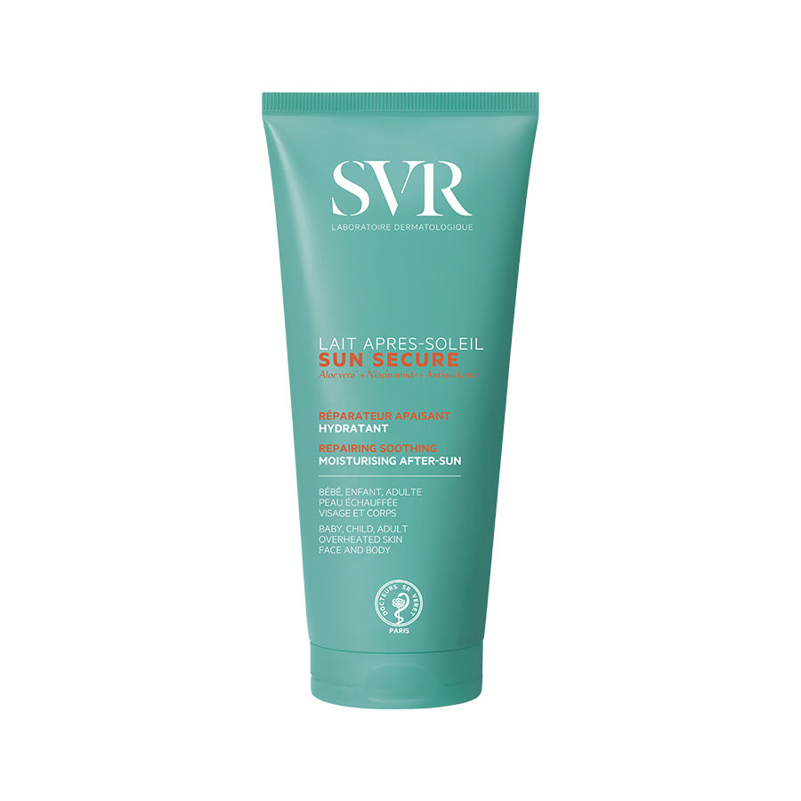 SVR Sun Secure After-Sun Milk es una crema gel para después del sol suavizante y reparadora para bebés, niños y adultos. Textura sin perlas para uso cruzado, facial y corporal. Con aloe vera, niacinamida y antioxidantes, alivia las quemaduras solares, hidrata y ayuda a reparar el daño solar.