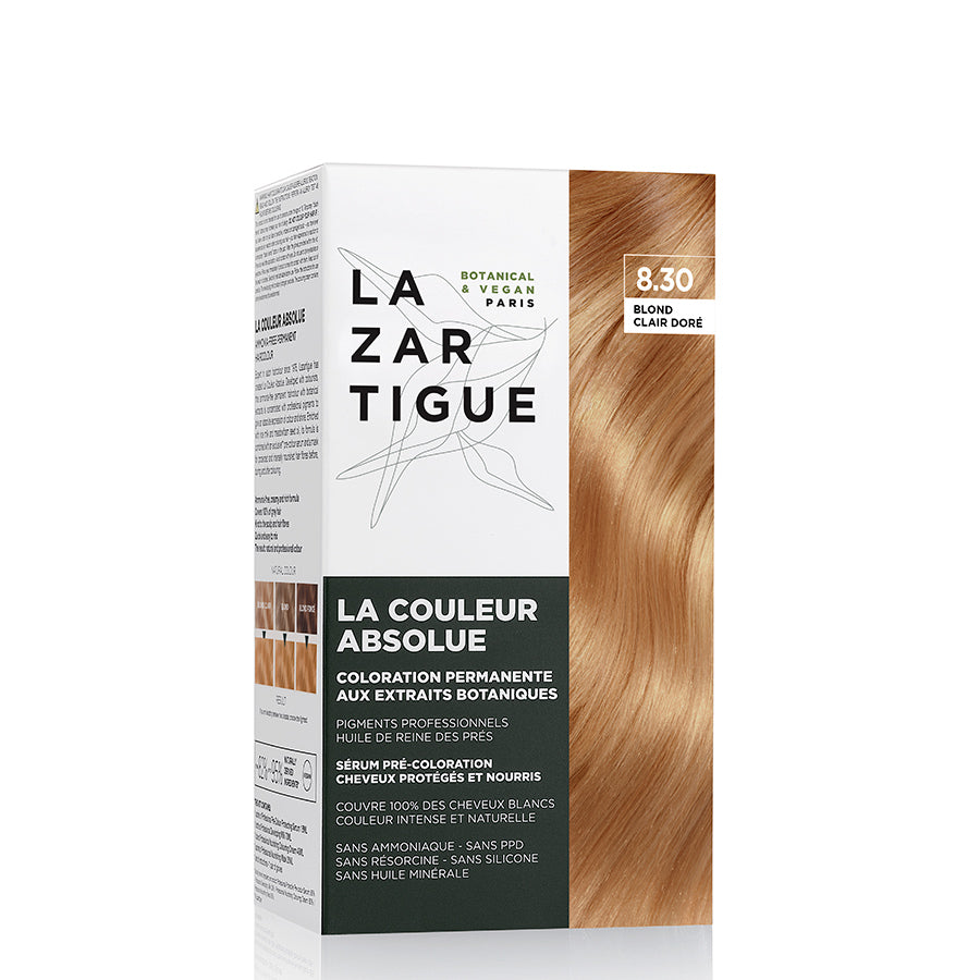 Lazartigue Coloración Permanente Tono 8.30 Rubio Claro Dorado con extractos botánicos y sin amoniaco. Su concentración de pigmentos profesionales le permite dar absoluta expresión de color y brillo al cabello. Su fórmula vegana, rica en leche de arroz y aceite de reina de los prados, protege y nutre la fibra capilar. El resultado es un color natural y profesional que cubre el 100% de las canas.