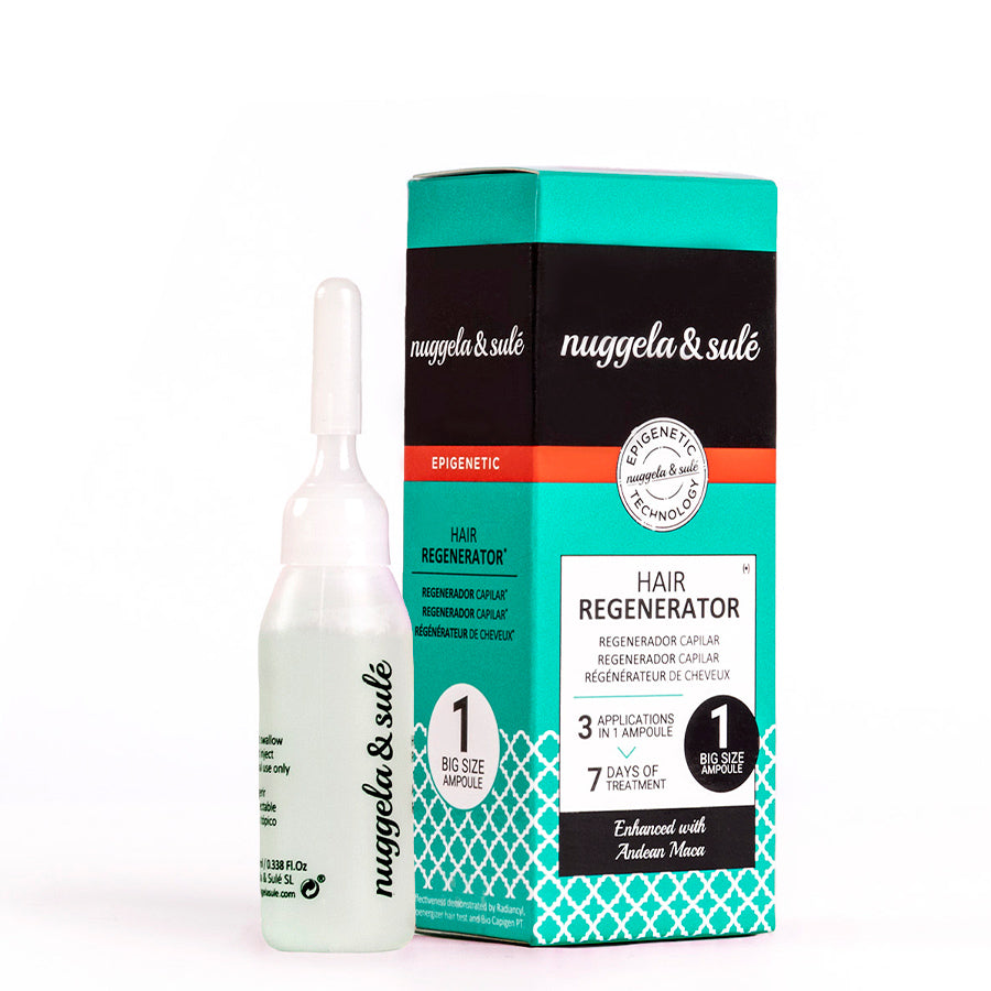 Ampolla Regeneradora Capilar de Nuggela & Sulé con una potente combinación de principios activos, vitaminas y micronutrientes, que fortalecen el cabello y aumentan su grosor y densidad. Regenera el cabello y puede ser utilizado por hombres y mujeres con cabello fino, frágil o con pérdida de densidad.