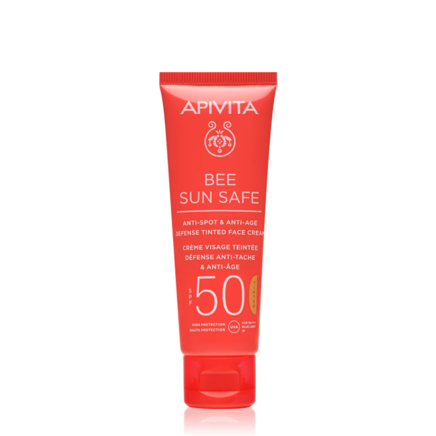 Apivita Bee Sun Safe Antimanchas e Antienvelhecimento Creme com Cor FPS 50+ 50ml é um protetor solar aveludado e com cor que oferece proteção solar de largo espetro, UVB, UVA, IV e luz azul. Ajuda a prevenir o aparecimento de manchas e rugas. Deixa a pele macia e hidratada e uniformiza o tom. Muito resistente à água. Pode ser usado em pele sensível.
