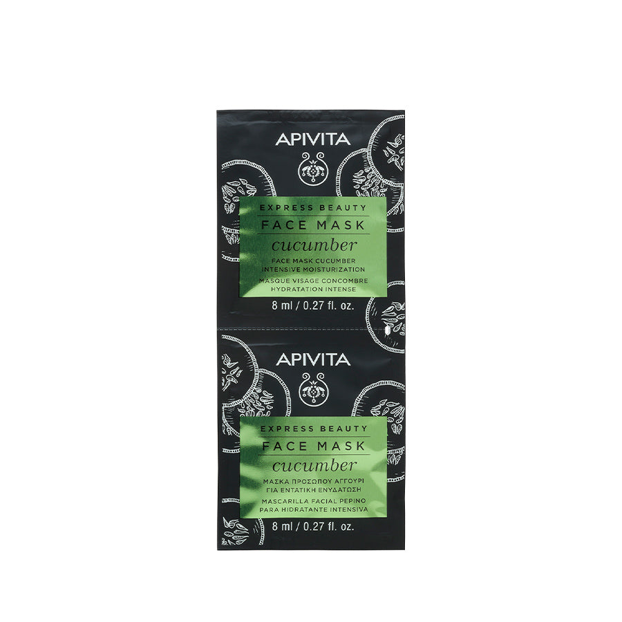 Apivita Express Beauty Máscara Hidratação Intensiva Pepino 2x8ml é uma máscara com 97% de ingredientes de origem natural para a hidratação profunda do rosto. Hidrata em profundidade, refresca e suaviza a pele.