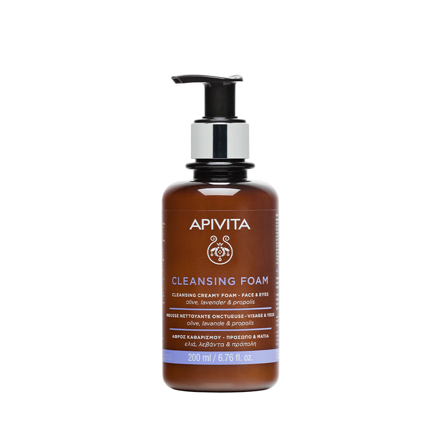 Apivita Espuma de Limpeza Cremosa com azeitona, lavanda e própolis, limpa eficazmente o rosto e olhos olhos, sem secar a pele. Remove a maquilhagem e as impurezas