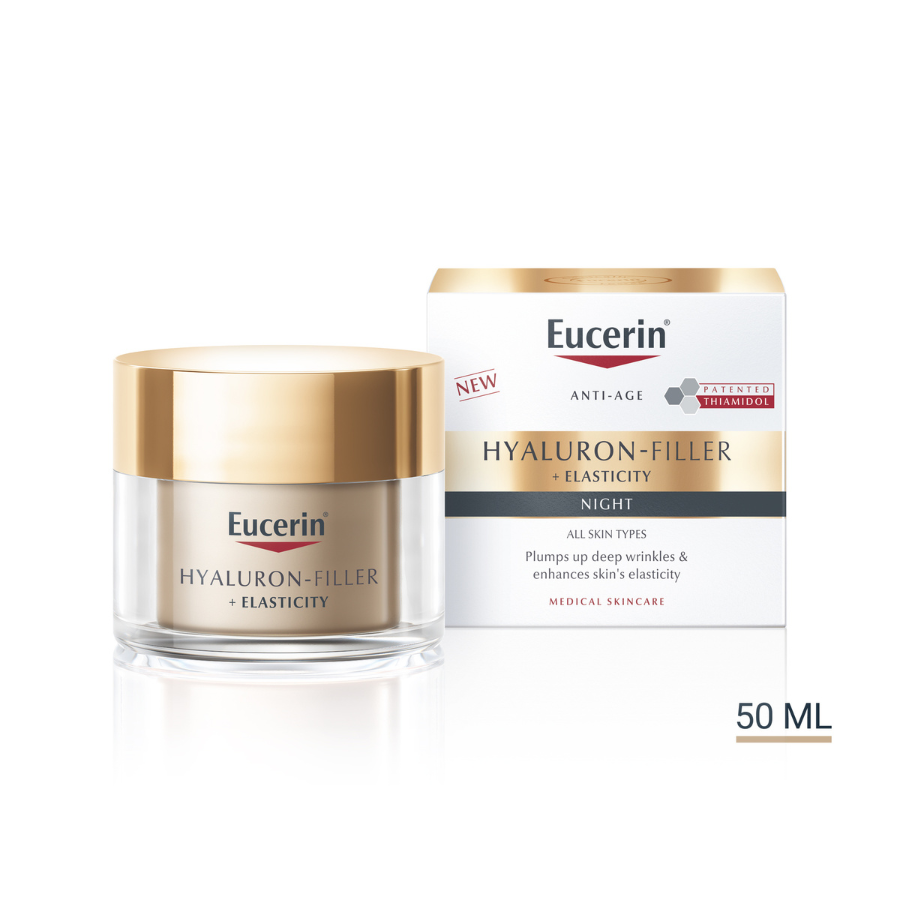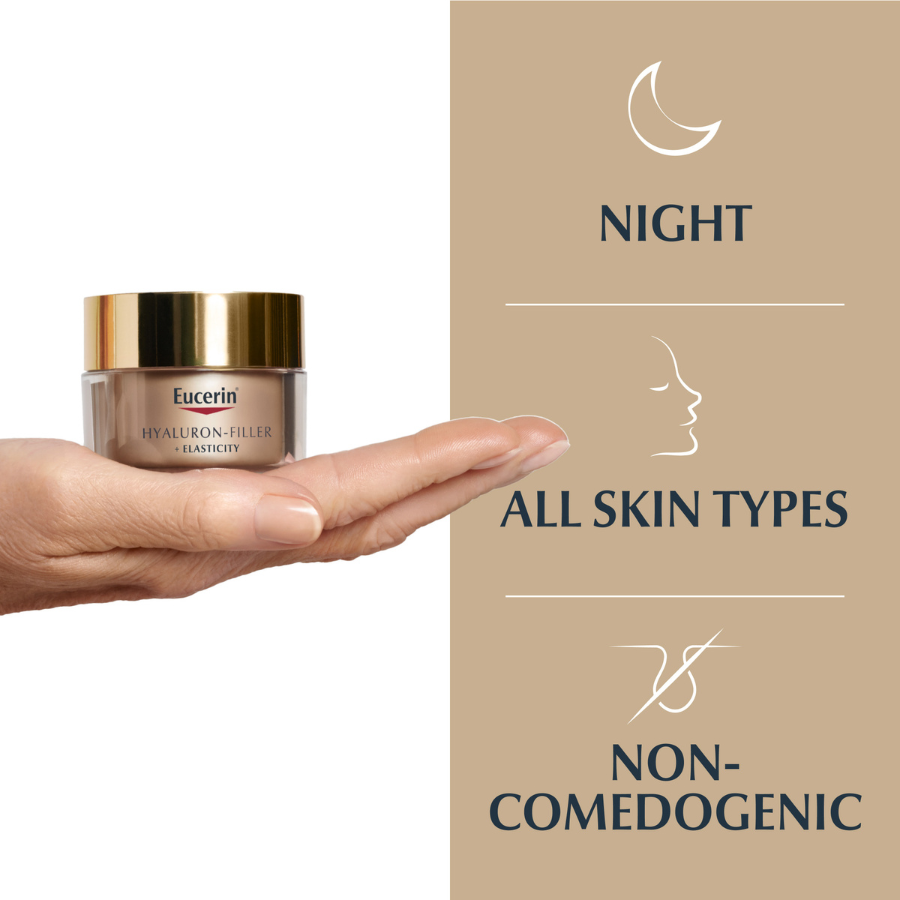 Eucerin Hyaluron-Filler + Elasticity Creme Noite é um creme de noite anti-envelhecimento que preenche as rugas profundas, melhora a elasticidade da pele e corrige as manchas da idade.
