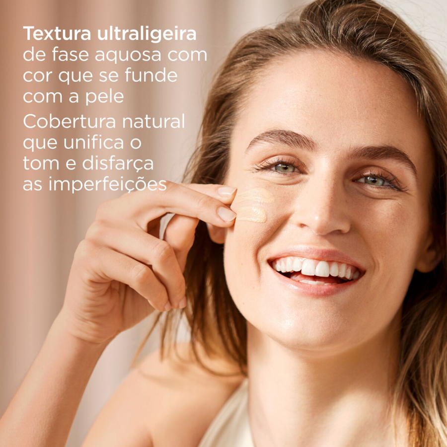 Cobertura natural que disfarça imperfeições, uniformiza o tom e dá boa aparência;