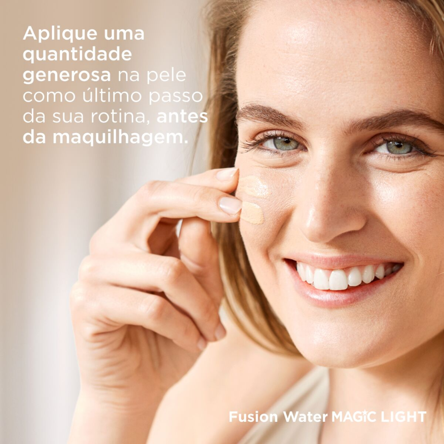 Isdin Fotoprotector Fusion Water Magic Color Light SPF50+ é um protetor solar com cor e ação antioxidante que protege e hidrata a pele. Cobertura natural que disfarça imperfeições e uniformiza o tom sem irritar os olhos.