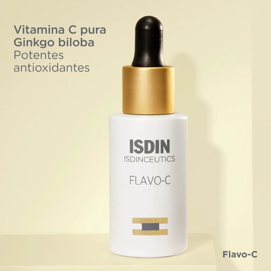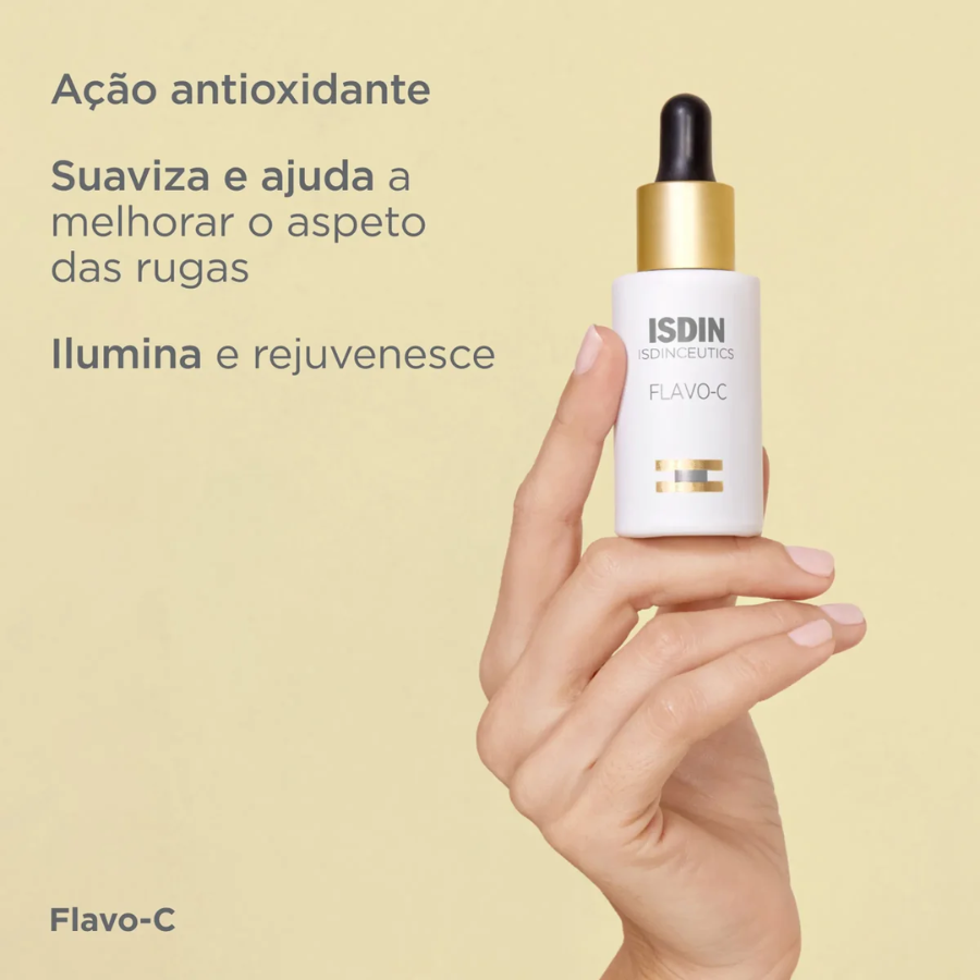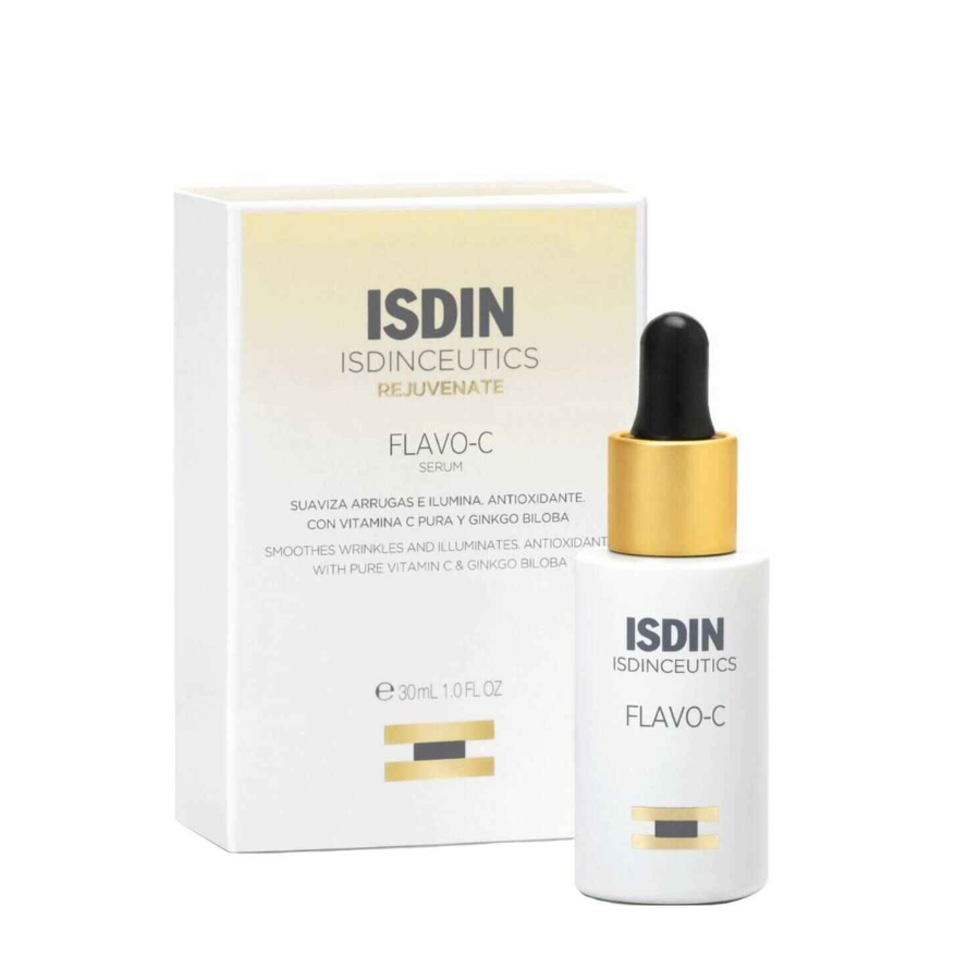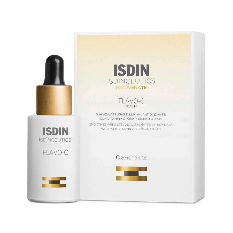 Isdin Isdinceutics Rejuvenate Flavo-C Sérum formulado com vitamina C pura e extrato de Ginkgo biloba que potencia a luminosidade da pele. Ajuda a reforçar o colagénio, diminuindo visivelmente as linhas de expressão e rugas, melhorando o aspeto da pele.