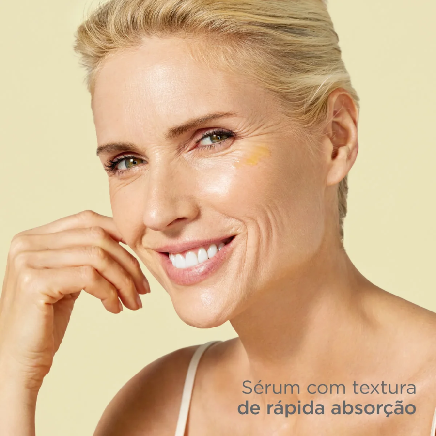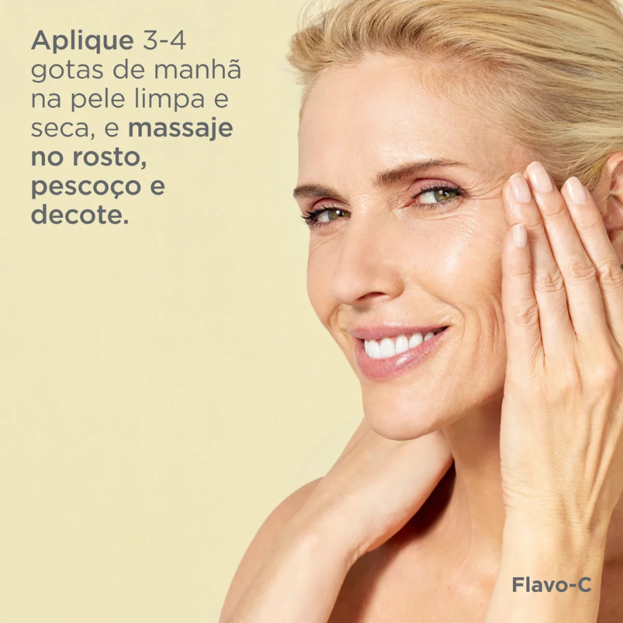 Doseie 3-4 gotas do produto na palma da mão e massaje no rosto, pescoço e decote, evitando a área dos olhos.