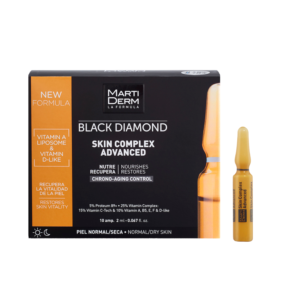 Martiderm Black Diamond Skin Complex Advanced Ampolas é a versão renovada de Skin Complex+. É um cuidado antienvelhecimento, indicado para peles normais a secas. A fórmula contém Proteum 89+, que protege dos efeitos da radiação ultravioleta; e um complexo vitamínico, com ação antioxidante e antienvelhecimento. Fornece hidratação, nutrição e luminosidade para um aspeto rejuvenescido.