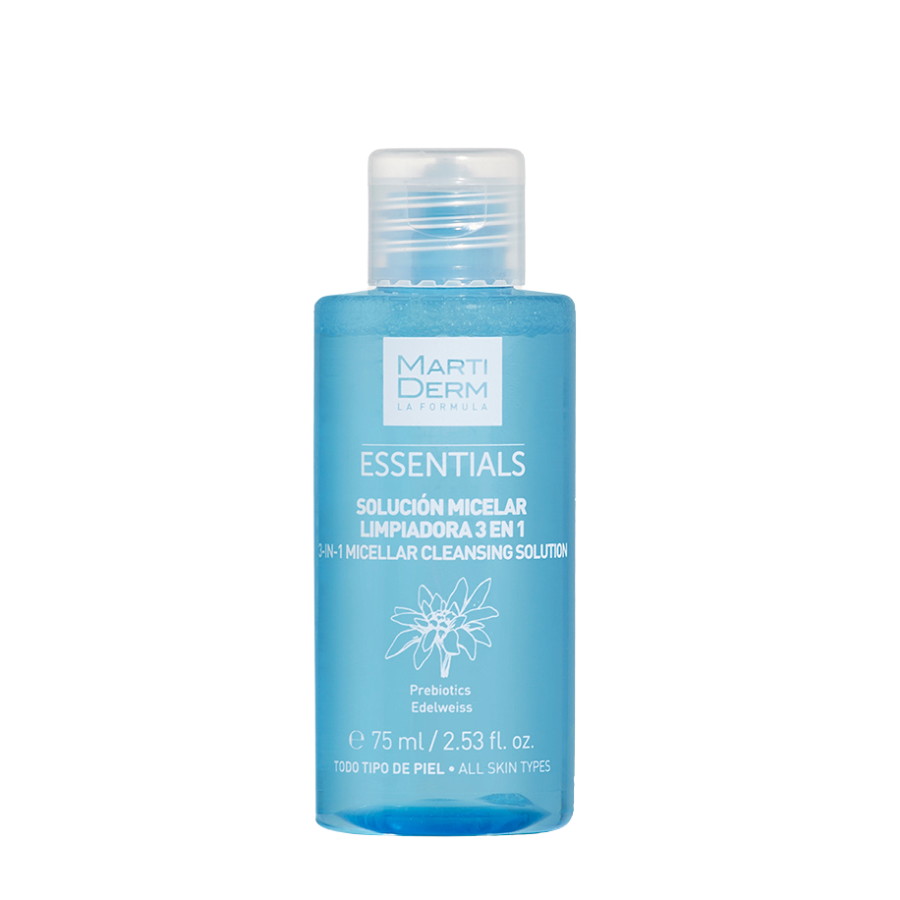 Martiderm Essentials Solução Micelar Limpeza 3em1 é um produto de limpeza de uso diário, em formato de solução micelar, que limpa e elimina as impurezas e restos de maquilhagem suavemente e sem ressecar, deixando a pele limpa e hidratada.