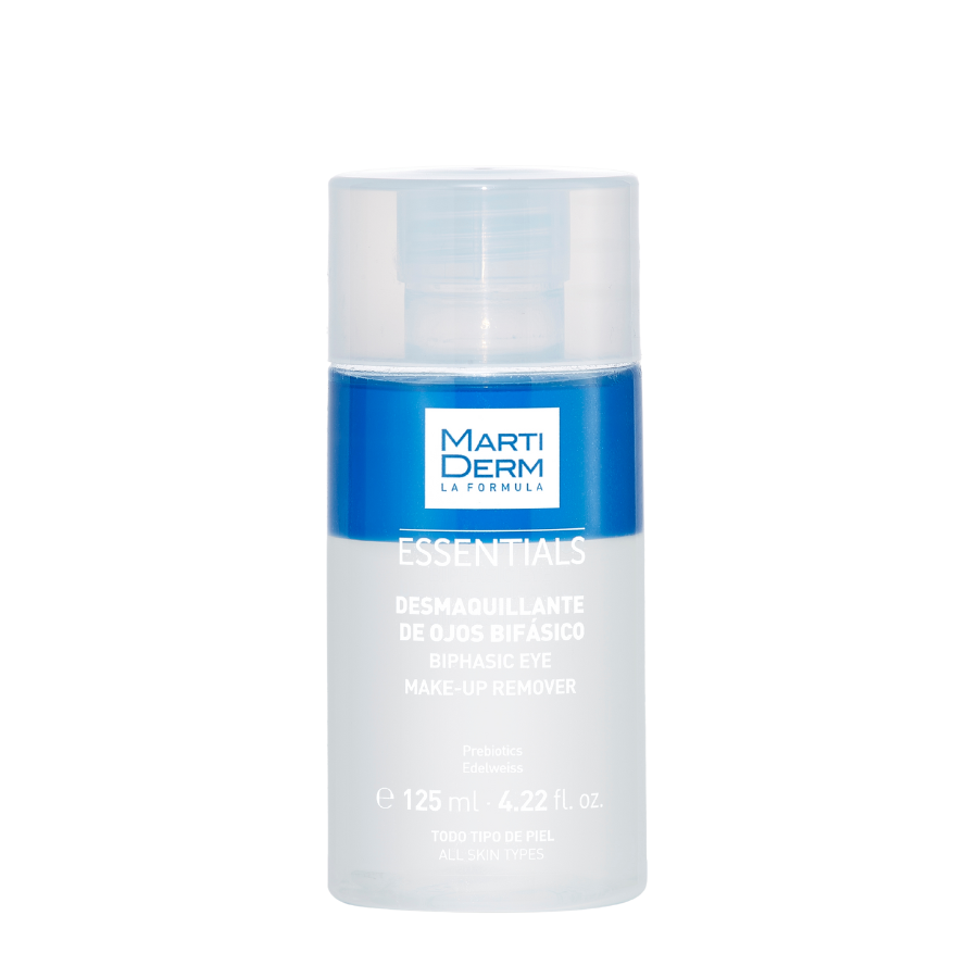 Martiderm Essentials Desmaquilhante Olhos Bifásico limpa, hidrata e protege. Limpa suavemente e elimina a maquilhagem waterproof sem ressecar a pele. Deixa a pele hidratada sem efeito oleoso. Além disso, não irrita, não pica nem arde nos olhos, sendo muito cuidadoso com as pestanas.