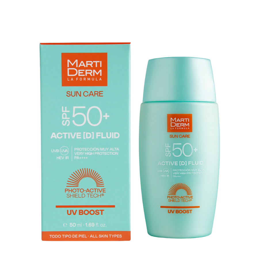 Martiderm Sun Care Active D Fluid SPF50+ é um fotoprotetor facial de textura fluida que inclui a Photo-Active Shield Techology®, permite otimizar a concentração de filtros na fórmula garantindo uma proteção UVA e UVB ótima. Além disso, contém ativos antioxidantes como o extrato de cacau que completa a proteção de amplo espectro para todos os tipos de pele. Contém ativos hidratantes.