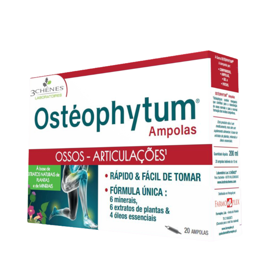 Osteophytum Ampolas é um suplemento alimentar em formato líquido que contribui para o normal funcionamento das articulações, a manutenção óssea e a flexibilidade. É uma fórmula concentrada que combina componentes essenciais da cartilagem com extratos de plantas.