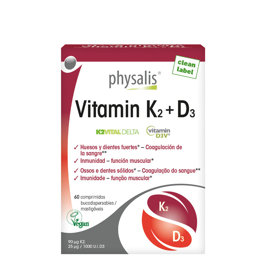 Physalis Vitamin K2 + D3 é um suplemento que ajuda à manutenção de ossos e dentes fortes, na normal coagulação do sangue e na imunidade e função muscular.