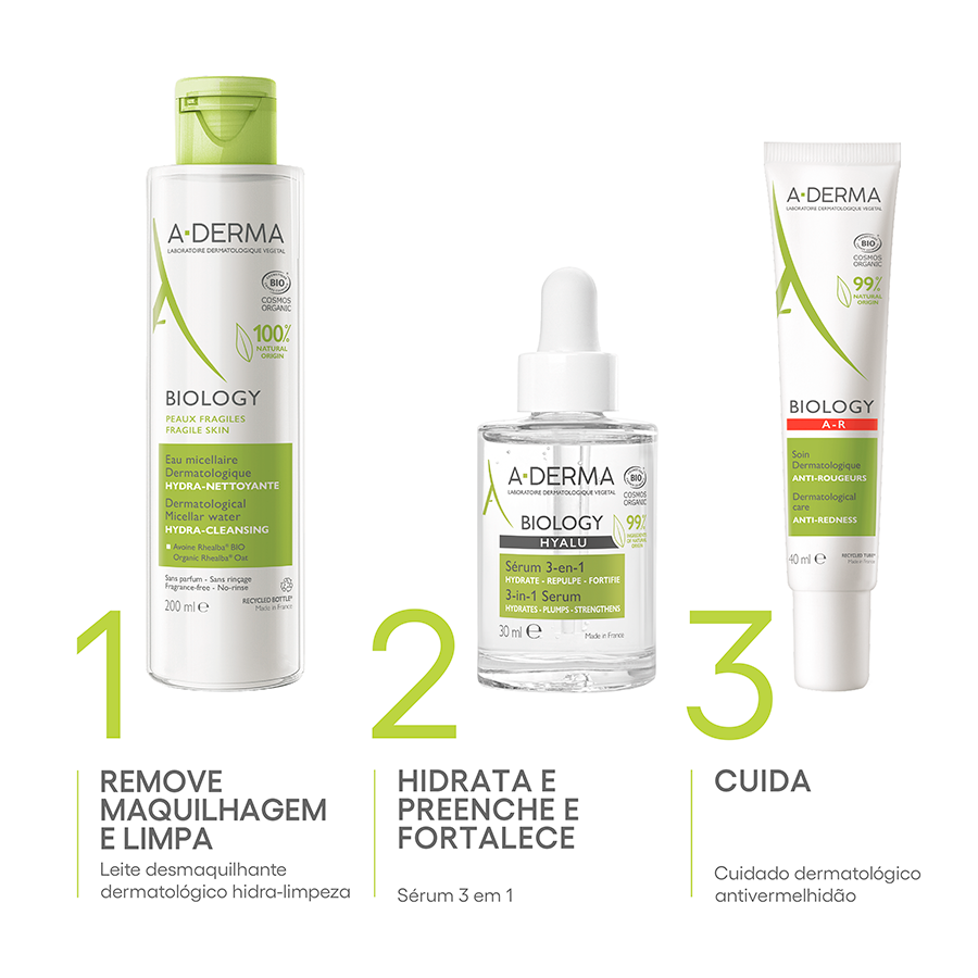 A-Derma Biology Hyalu Sérum 3 em 1 tem uma textura em gel fresca e não pegajosa. Hidrata em apenas 1 minuto, preenche e fortalece a pele frágil do rosto graças aos poderosos ingredientes ativos com propriedades reequilibrantes e hidratantes. Testado em pele alérgica, sem perfume e óleos essenciais e não comedogénico, a sua fórmula de origem natural certificada 99% orgânica contém apenas os ingredientes essenciais para garantir a tolerância ideal, com o máximo cuidado para a pele frágil.