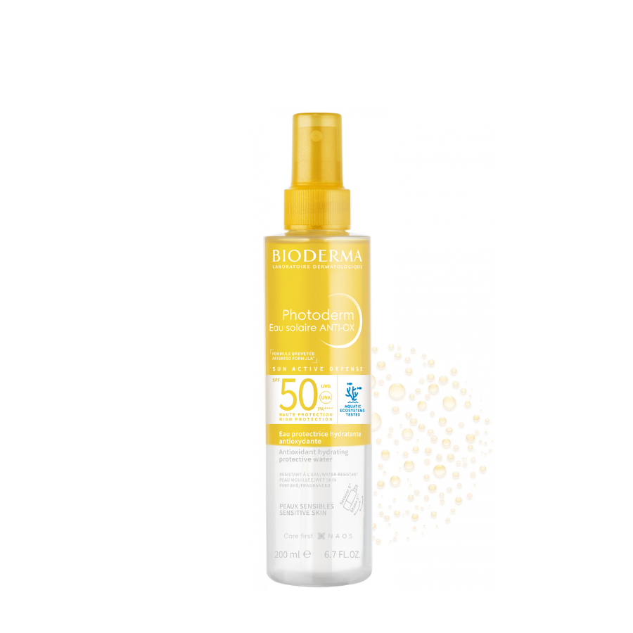 Bioderma Photoderm Eau Solaire Anti-Ox SPF50+ é uma água solar que hidrata a pele e oferece alta proteção solar contra os raios UVA/UVB. Contém antioxidantes que previnem danos celulares e o envelhecimento da pele. Não só protege a pele como a hidrata profundamente.
