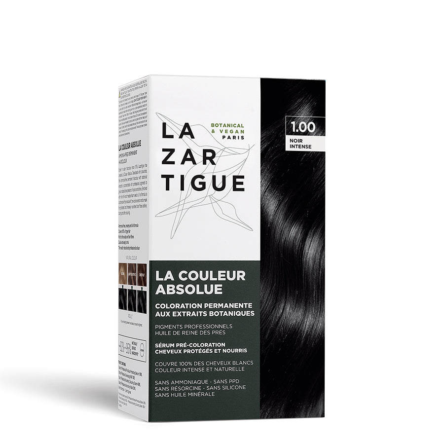 Lazartigue Coloração Permanente Tom 1.00 Preto com extratos botânicos e sem amoníaco. A sua concentração de pigmentos profissionais permite dar uma expressão absoluta da cor e brilho ao cabelo. A sua fórmula vegan, rica em leite de arroz e óleo rainha-dos-prados, protege e nutre a fibra capilar. O resultado é uma cor natural, profissional, que cobre 100% dos cabelos brancos.