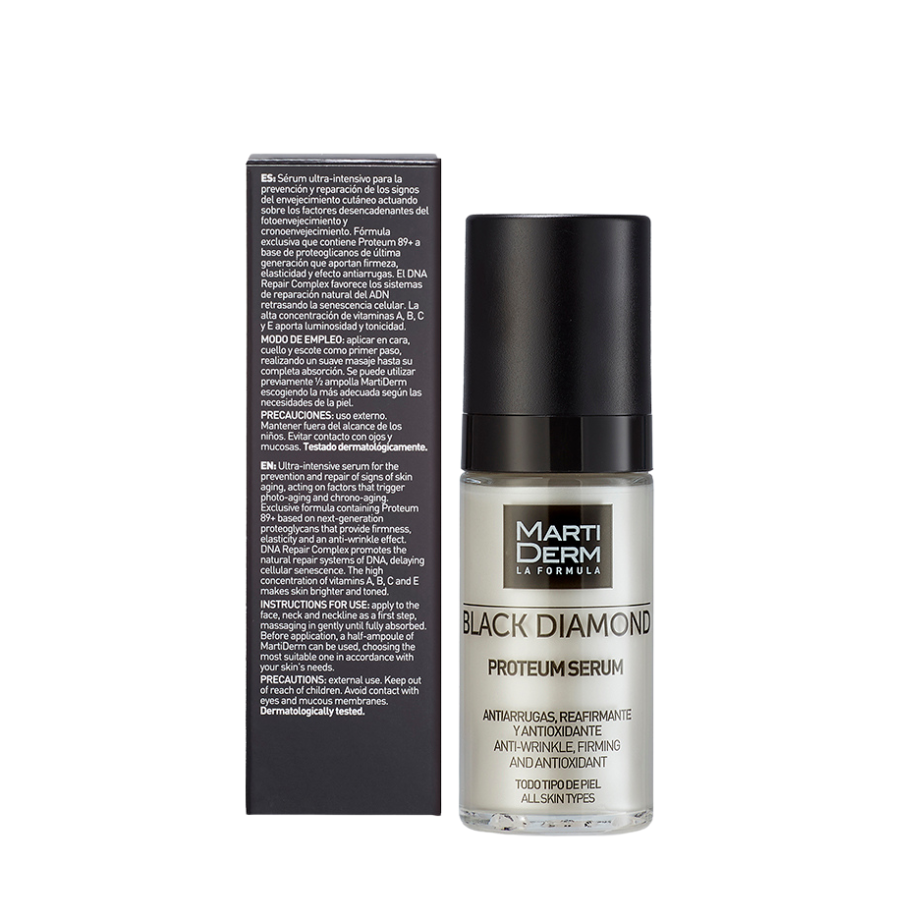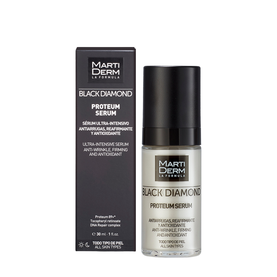 Martiderm Black Diamond Proteum Sérum ajuda a combater as rugas, refirmar e proteger a pele contra o envelhecimento. Com tripla ação: anti-rugas, refirmante e antioxidante. Trava o envelhecimento atenua as linhas e rugas. Estimula a regeneração celular natural e protege a pele contra as agressões externas diárias. Aumenta a firmeza, elasticidade e luminosidade da pele. Proporciona hidratação e suavidade, com um acabamento perolado. Ideal para pele madura.