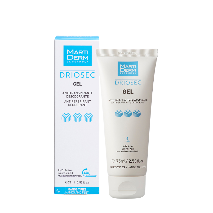 Martiderm Driosec Gel Desodorizante Mãos e Pés é um desodorizante em gel antitranspirante para o controlo integral da transpiração excessiva de mãos e pés. A proporção úncia de sais de alumínio e zircónio de última geração, assim como os complexos antimicrobianos e reguladores da humidade, convertem esta gama na mais completa para o controlo da transpiração excessiva.