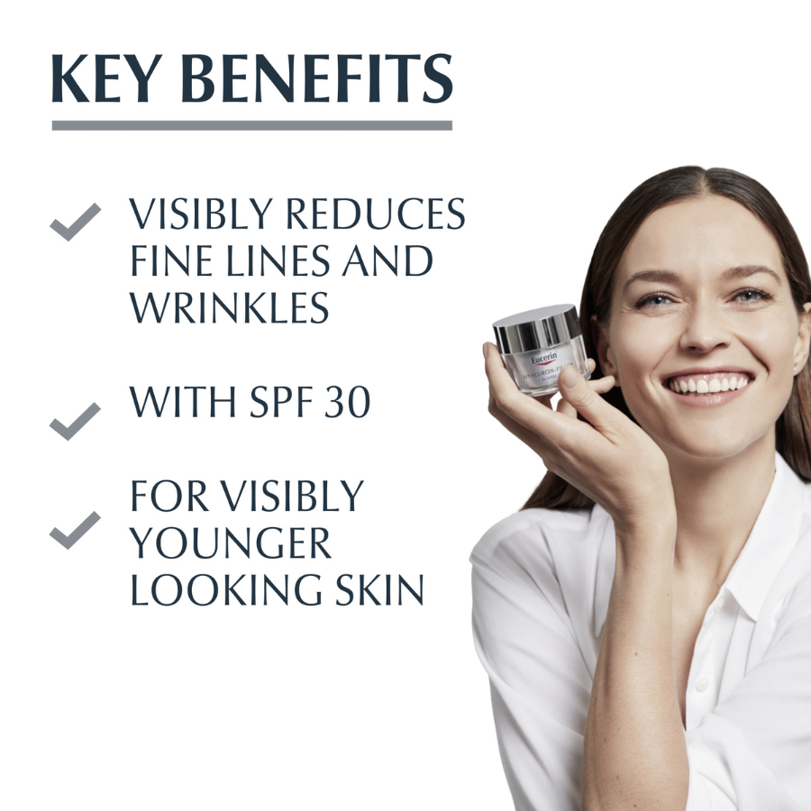 Eucerin Hyaluron-Filler 3x Effect Creme de Dia FPS30 é um creme hidratante de dia que preenche, estimula, protege e neutraliza o processo de envelhecimento. Para uma pele visivelmente mais lisa, radiante e com aparência mais jovem.