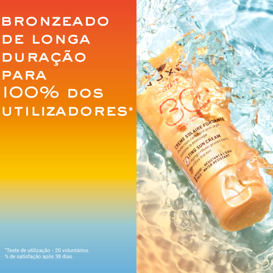 Nuxe Sun Creme Fundente SPF30 protege eficazmente o rosto e o corpo dos raios solares ao mesmo tempo que realça o bronzeado. Com um exclusivo complexo filtrante patenteado, proporciona proteção UVA/UVB de amplo espectro e previne o fotoenvelhecimento prematuro da pele graças à sua dupla eficácia contra UVA.
